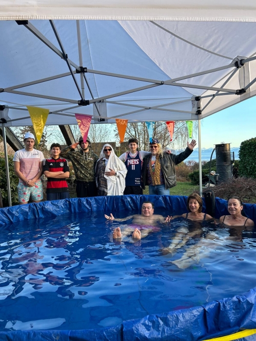 Fête déguisée plus jaccuzzi, un défi selon le costume. Première baignade pour les courageux, avec du soleil mais l'eau à 26 degrés. Les derniers ne sont sortis qu'une fois le feu arrêté et la température en baisse légère mais constante.