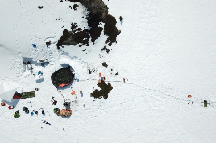 Forage dans la croûte de glace et neige sur le lac pour trouver de l'eau, avec des outils bien professionnels: Casserole de brisolée... |