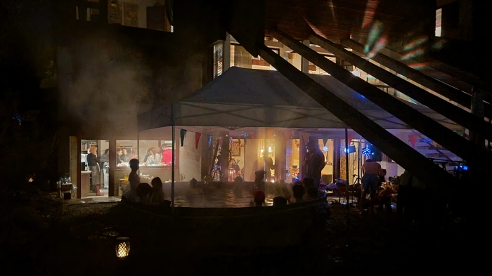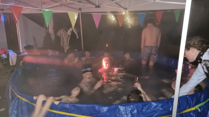 Fête déguisée plus jaccuzzi, un défi selon le costume. Première baignade pour les courageux, avec du soleil mais l'eau à 26 degrés. Les derniers ne sont sortis qu'une fois le feu arrêté et la température en baisse légère mais constante.