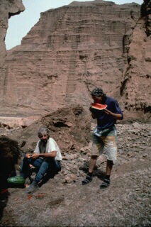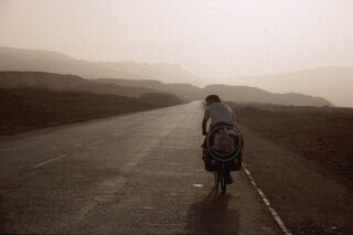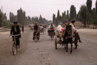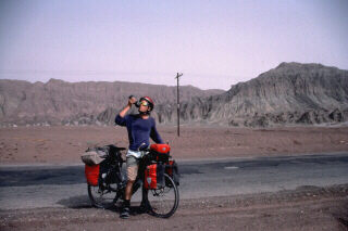 ROUTE NORD DE LA SOIEDe Kashgar à Korla, la route nord de la Soie longe le désert du Taklamakan, au pied de la chaîne des Tien Shan. Après notre expérience difficile (à cause de la chaleur) dans le désert turkmène, nous avons été surpris par la température modérée dans cette région. Elle était due à une sorte de brume de poussière poussée par le vent qui voile constament le soleil. La pause de midi se passe souvent dans les oasis ouïghurs, à manger le traditionnel LAGHMAN, bol de pâtes faites à la main, de viande de mouton et de légumes. C'est aussi le type d'endroit que choisissent les nombreux camionneurs de passage pour faire leur pause et, parfois, essayer les vélos à notre insu. Sur la route, le contact avec les camionneurs est assez pénible à cause de leur habitude de klaxonner durant 20 secondes, d'un bruit tonitruant, lorsqu'ils passent à notre hauteur. Plusieurs fois, nous voyons des camions de charbon retournés avec le chauffeur assis à côté en train de se demander s'il va se remettre sur pattes.