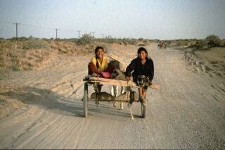 DESERT DU TAKLAMAKANAu sud de Korla, nous nous enfonçons dans le désert du Taklamakan. Rapidement, la route se transforme en une piste assez mauvaise. Après deux jours d'efforts intenses, nous commençons à douter de la possibilité de traverser ce désert en vélo, notamment à cause du problème de l'eau. La piste ensablée par endroits nous incite finalement à prendre un camion pour rejoindre la ville de Ruoquiang, au pied des Monts Kunlun. A Ruoquiang, la piste ne s'améliore guère et nous optons pour le camion jusqu'au désert du Tsaidam avant Golmud. Il n'est cependant pas si simple de trouver un camion, surtout lorsque la route où nous attendons est déviée!! Après un jour d'attente sans succès, nous commençons à nous impatienter. Reynald et David décident alors de retourner en bus à Korla et de prendre ensuite le vélo par la route de Dunhuang. Alain, Frédy et Jean-Christophe prendront un camion pour le Tsaidam le lendemain et passeront ensuite deux mois au Tibet. Le moment des adieux est donc venu et le voyage se terminera en deux groupes jusqu'au Népal. |