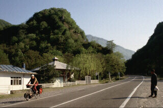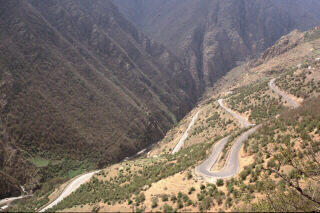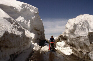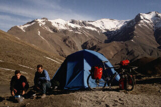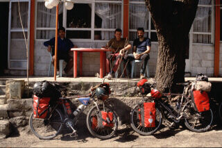 VALLEE DE BALADEAyant décidé de quitter la route principale qui longe la mer Caspienne, nous nous retrouvons sur un col digne de ceux que l'on rencontre dans les Alpes. La route traverse des forêts verdoyantes, se fraie un passage dans des gorges encaissées avant de décrire des lacets interminables. Peu à peu, la vallée devient plus sèche, la chaleur se fait pesante et la route monte de plus en plus. Heureusement, il n'y presque plus de circulation et l'effort à fournir pour affronter cette montée de près de 3000 mètres est largement récompensé par la beauté du paysage qui s'offre à nous. Nous passerons ensuite une nuit sous tente près du col enneigé qui s'ouvre sur la vallée de Balade. C'est une vallée avec de petits villages préservés, des arbres fruitiers en fleurs, comme une oasis au milieu des montagnes pelées et enneigées.Le calme qui y règne contraste singulièrement avec ce que nous avons vu au bord de la mer Caspienne. Après ce détour dans la chaîne de l'Elbourz, nous retrouvons la plaine, la mer et la circulation en arrivant à Sari. Nous décidons d'y laisser les vélos qulques jours, le temps de prendre le bus pour visiter Isphahan, Shiraz et Persépolis dans le sud du pays.