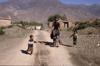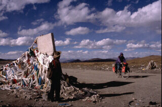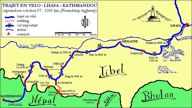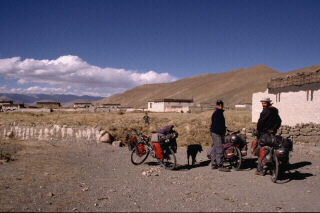 LA FRIENDSHIP HIGHWAYNous repartons en direction de Katmandu en suivant la 'Friendship Highway', avec quelques variantes. Nous choisissons notamment de nous écarter de la route principale pour passer par le lac sacré Yamdrok et traversons plusieurs petits villages construits en pisé. À côté des maisons, des bouses de yack sèchent pour servir de combustible en prévision de l'hiver qui approche. Des enfants nous poursuivent en s'accrochant aux vélos lorsque nous traversons les villages. Nous assistons à de magnifiques scènes de moissons en cette fin septembre. Les montagnes très minérales contrastent avec les fonds de vallées vertes et très colorés. Avant de quitter le Tibet pour redescendre sur le Népal, nous choisissons de faire un crochet pour admirer le versant nord de l'Everest. |